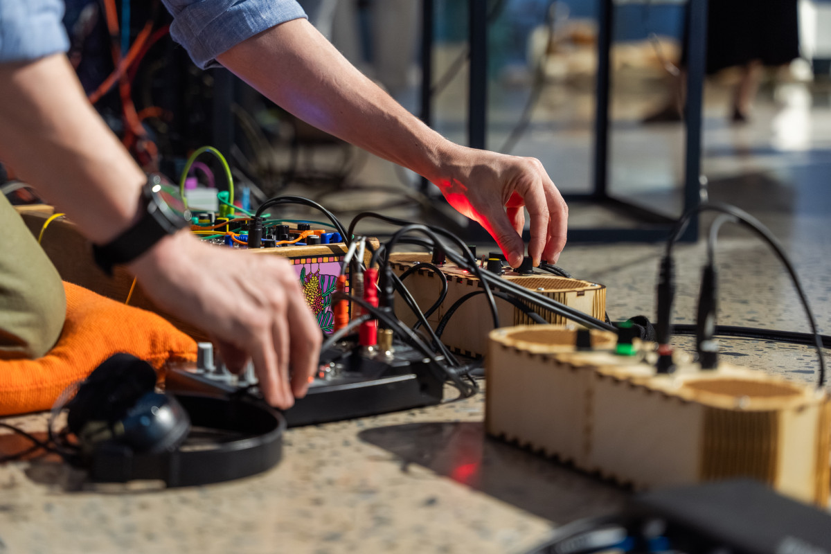 Electronic music performance with wearable sound and home-made custom electronic circuits.