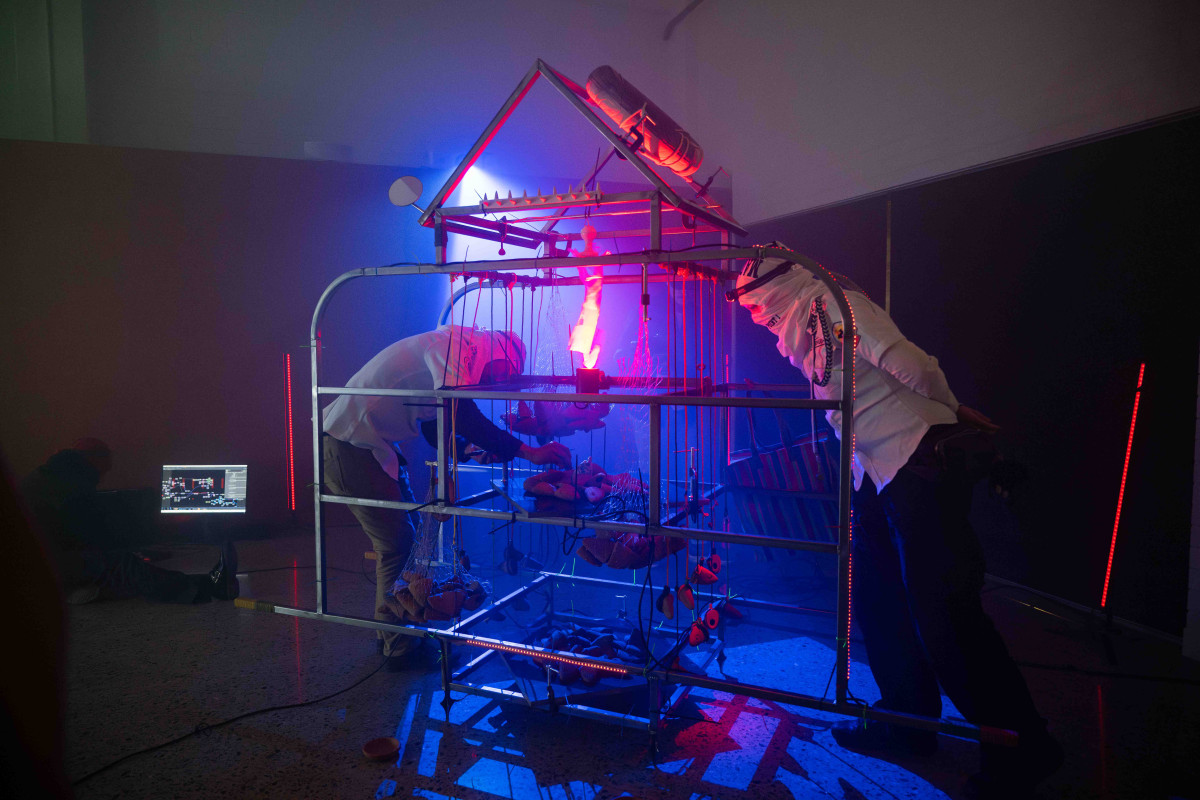 Input/Output centres on a large-scale steel structure fitted with ceramic objects, thread, fabric, and found objects created by Valenzuela and installed in the front gallery space at ACE. The work draws on several structures commonly used in the Philippines, combining the street stall, sari-sari (assorted goods) store, kariton, and paipitan (a cage used for transporting livestock), through which Valenzuela explores ideas around connection and isolation. Bennett and Dunne will collaborate with Valenzuela to extend these ideas through the incorporation of light and sound.